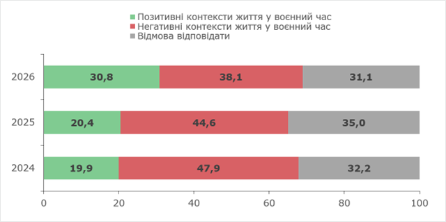 Цей аналіз дозволяє підтвердити висновок про те, що війна і втрати потроху втрачають свій переважний вплив на життя українців. Адже загалом відповіді в категорії «війна» (як позитивні, так і негативні; за винятком втрат, які винесені в окрему категорію) вказали 19,1% українців порівняно з 21,4% у 2025-му і 29,8% у 2024 році.