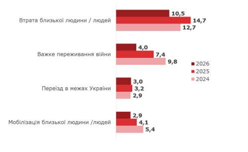 Згадки про те, що респонденти через війну втратили близьких, залишаються найбільш частотними (10,5%). В 2025 році частка таких відповідей складала 14,7%, в 2024 – 12,7%.