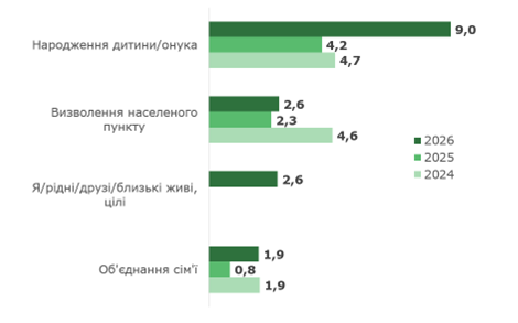 Зокрема, говорячи про найважливіші події в своєму житті за чотири роки повномасштабної війни, як і в 2025 році, українці найчастіше називали втрату близької людини: про це сказали 10,5%, але це в півтора раза рідше, ніж торік. Разом з тим, майже така ж частка – 9% – назвали найголовнішою подією народження дитини/онука, а це вдвічі більше, ніж торік.