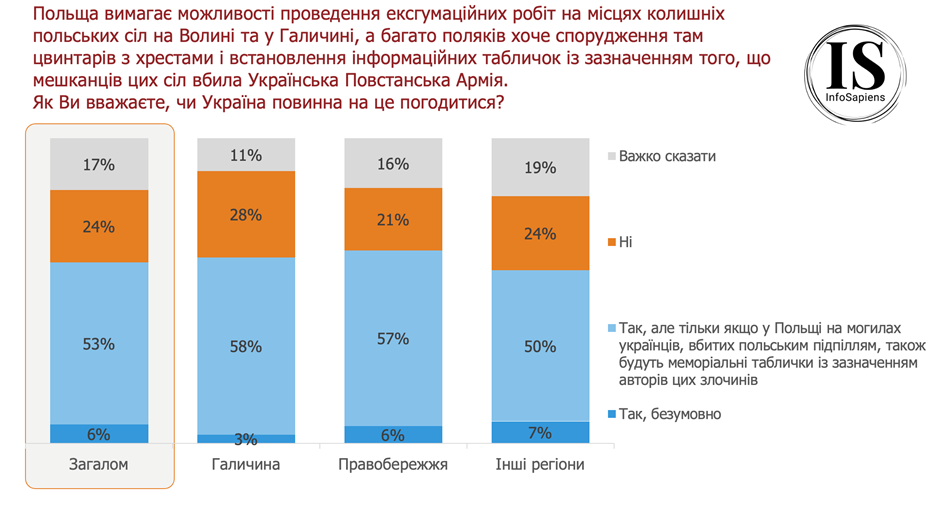 Польща вимагає можливості проведення ексгумаційних робіт на місцях колишніх польських сіл на Волині та у Галичині, а багато поляків хоче спорудження там цвинтарів з хрестами і встановлення інформаційних табличок із зазначенням того, що мешканців цих сіл вбила Українська Повстанська Армія. Половина українців (53%) готова на це погодитись за умови спорудження аналогічних пам'ятників українським жертвам польського підпілля, ще 6% готові погодитись безумовно, а 24% погодитись не готові.