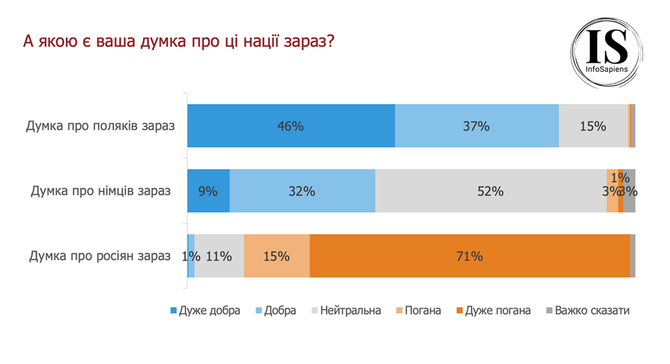 «До 2014 року, за результатами опитувань, росіяни були найближчим народом для українців – це не дивно, адже більшість українців родом з СРСР і засвоїли радянське кліше про так звані «братні народи, – каже Інна Волосевич, заступниця директора Info Sapiens. – Після окупації Донбасу та Криму найближчими стали білоруси – третій так званий «братній народ». Зараз більшість українців негативно ставляться до росіян, відносна більшість – до білорусів, а поляки стали для нас найближчим народом. Ми ніколи не забудемо того, що зробив для України польський народ у цей страшний час».